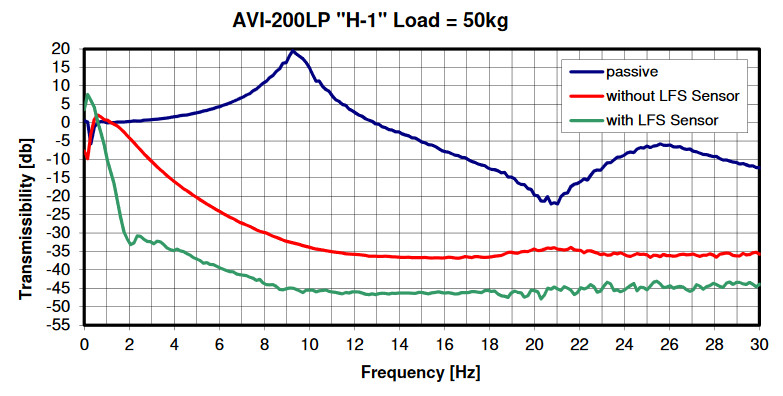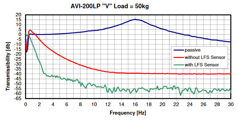 AVI-200-S는 기본적으로 한 쌍의 유닛과 하나의 컨트롤러로 구성되며, 최대 400kg의 하중을 탑재할 수 있습니다. 유닛의 갯수를 증가시키면 더 큰 하중도 지지할 수 있습니다. 제진은 1Hz부터 시작하고, 10Hz 이상에서 -35dB의 성능을 제공합니다.