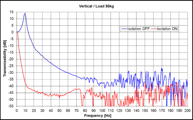 제진은 0.7Hz부터 시작하고, 10Hz 이상에서 -40dB 이상의 성능을 제공합니다. 저주파수 공진이 존재하지 않아서 일반적인 패시브 공압 제진대보다 성능이 훨씬 좋습니다. 방향과 위치 안정성이 뛰어나며, 6 자유도 제어 방식을 사용합니다. 정밀한 자동 높이 조절 장치는 하중에 변화가 생겨도 상판의 안정성을 유지합니다. 원격으로 장치의 ON, OFF 조작이 가능합니다.
